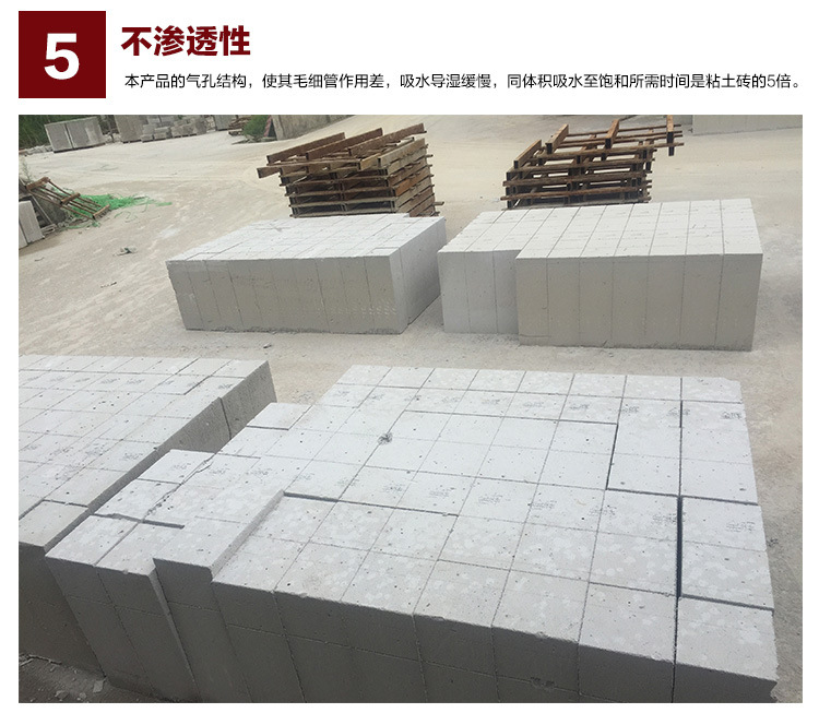 5、 不滲透性:本產品的氣孔結構,使其毛細管作用差,吸水導濕緩慢,同體積吸水至飽和所需時間是粘土磚的5倍。
